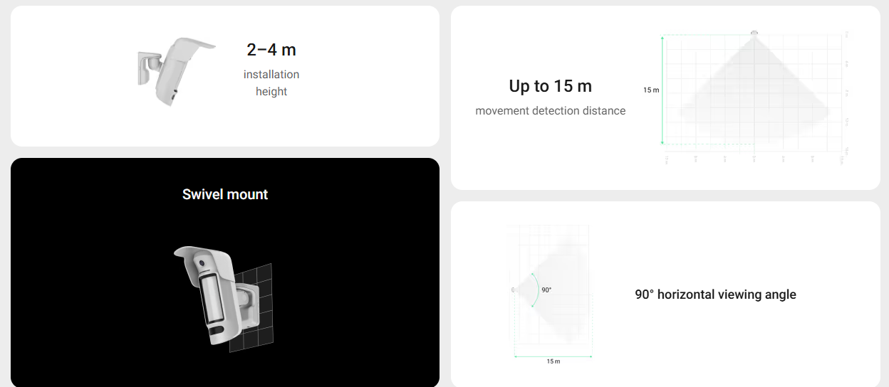 MotionCam Outdoor HighMount PhOD beschikt over het Wings radioprotocol voor tweerichtingscommunicatie om foto's en grote hoeveelheden data te verzenden. Dit protocol is nodig voor de ingebouwde camera voor fotoverificatie. Tevens is het mogelijk om een foto op aanvraag of via een scenario te ontvangen (PhOD - Photo On Demand) De anti-mask detectie calibreert automatisch door de omgeving te analyseren wanneer de detector op de bracket geplaatst wordt. Indien er dan obstakels worden waargenomen zal dit gedetecteerd en gemeld worden. De installatiehoogte van de bewegingsdetector is van 2 tot 4m en heeft een bereik van 15 m.